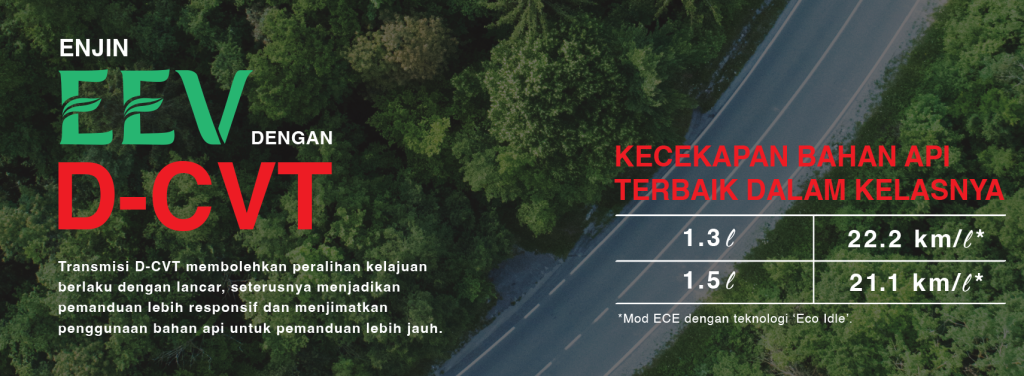 PRESTASI OPTIMUM DAN KECEKAPAN YANG MENAKJUBKAN – Transmisi D-CVT membolehkan peralihan kelajuan berlaku dengan lancar, seterusnya menjadikan pemanduan lebih responsif dan menjimatkan penggunaan bahan api untuk pemanduan lebih jauh.